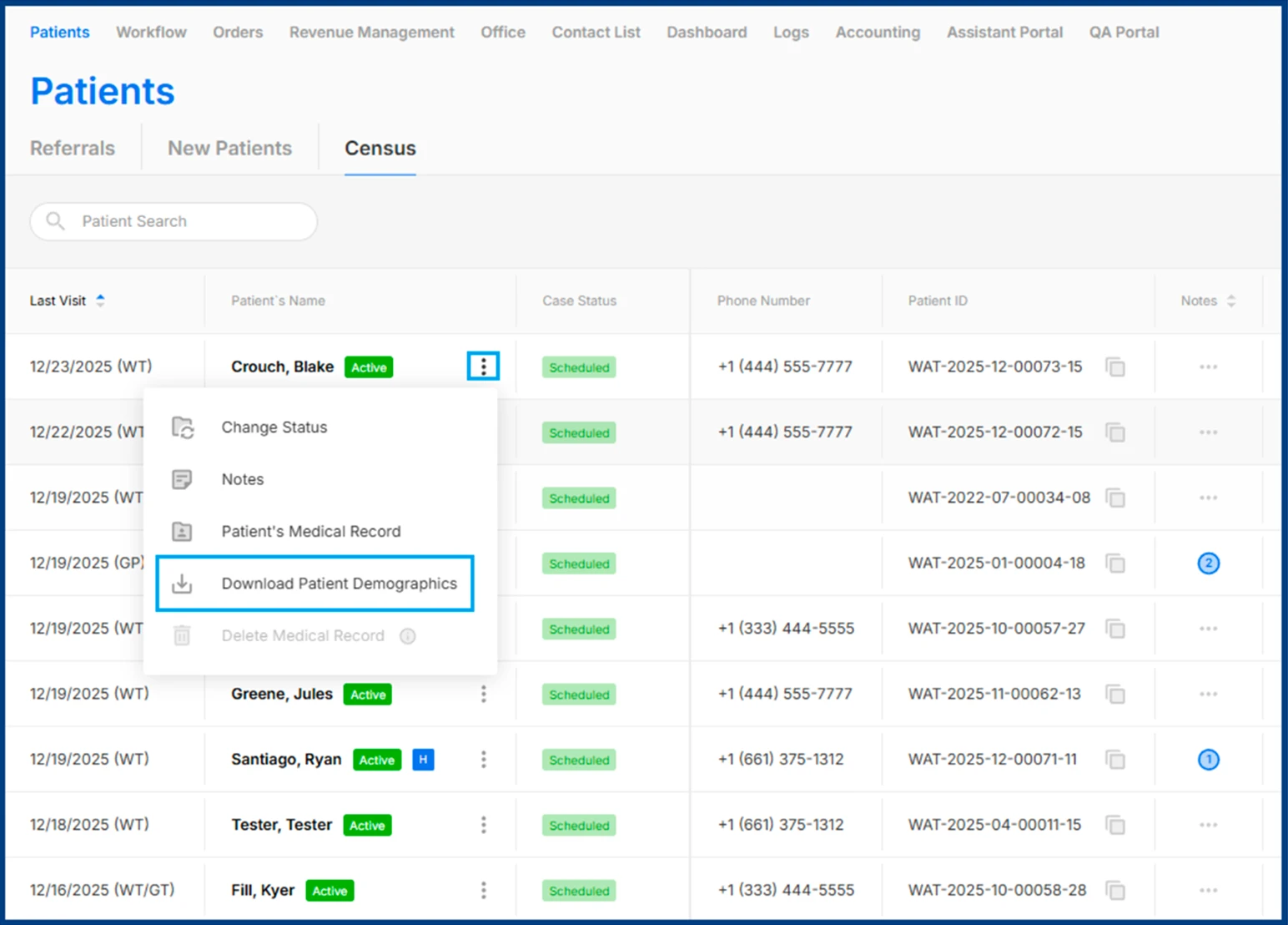 Click the three-dot menu next to the patient’s name and select Download Patient Demographics.