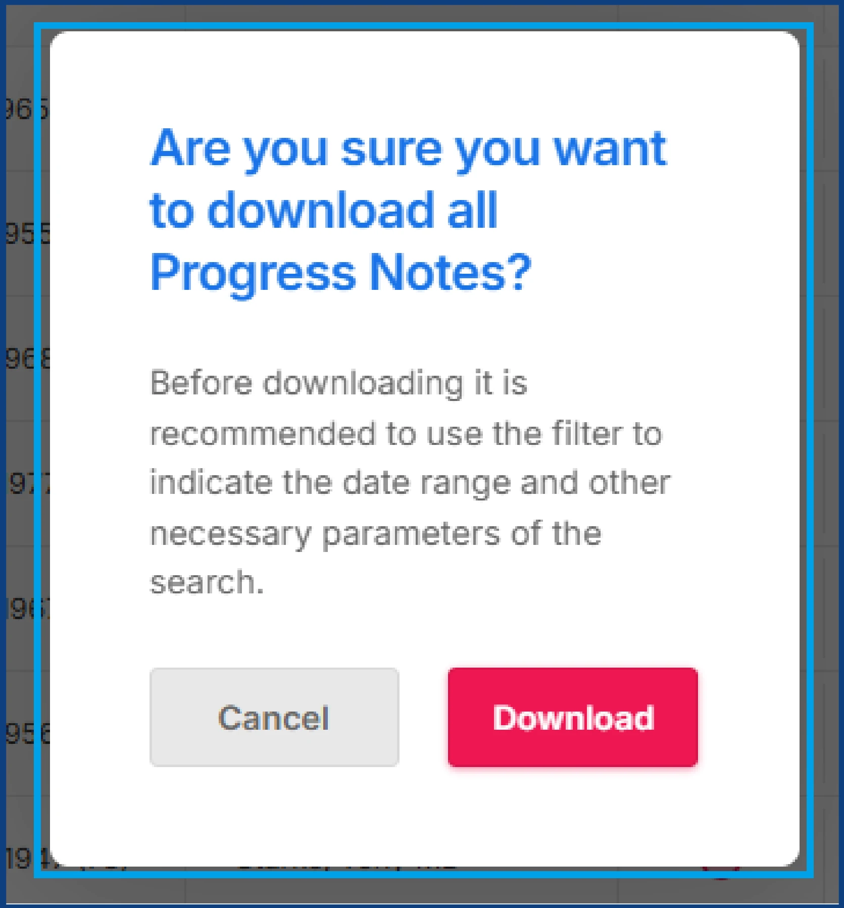 A confirmation pop up will appear asking, “Are you sure you want to download all Progress Notes?” Select the red Download button. A ZIP file containing all progress notes will then be downloaded to your device.